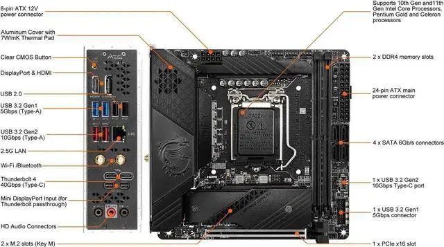 | Features | Supports 11th and 10th Gen Intel Core / Pentium Celeron processors for LGA 1200 socket Supports DDR4 Memory, up to 5600(OC) MHz Dual Thunderbolt 4 ports: Thunderbolt USB-C at true 40 Gb/s speeds, 8K display support, Daisy-Chaining and Multi-Port Accessory Architecture provide reliable connectivity and better user experience Extreme Power Design: INTERSIL digital PWM, direct 8 phases with 90A Smart Power Stage and Titanium Choke III unleash the true power of your processors Outstanding Cooling Solution: Frozr Heatsink, VRM Heat-pipe, Aluminum Cover and M.2 Shield Frozr ensure the extreme performance with low temp 2.5G LAN with latest Wi-Fi 6E: Onboard 2.5G LAN with LAN manager and latest Wi-Fi 6E solution which supports 6GHz spectrum delivering the best online gaming experience Twin M.2 Connectors: Onboard dual M.2 connectors for the maximum storage performance with one Lightning Gen 4 solution 10 Layer PCB with 2oz Thickened Copper: Provides higher performance and long-lasting system stability without any compromise Pre-installed I/O Shield: Better EMI protection and more convenience for installation |