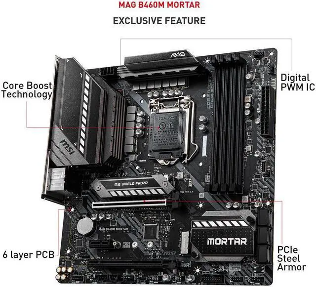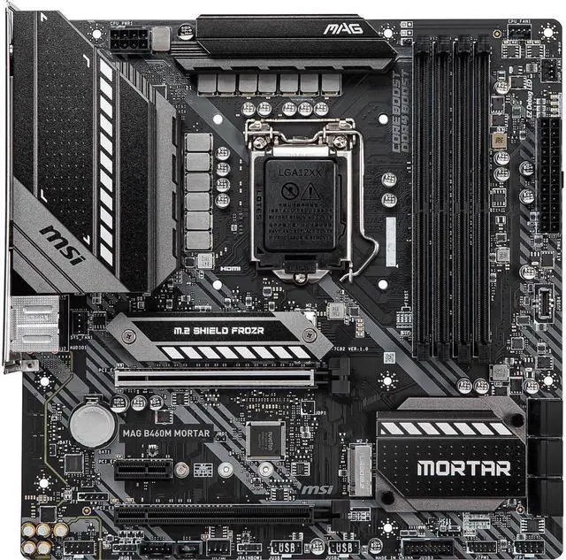 Intel B460 Supports 10th Gen Intel Core and Pentium Gold / Celeron processors for LGA1200 socket Intel Core i7/i9 Supports up to DDR4 2933 MHz Intel Core i5 (Below) Supports up to DDR4 2666 MHz Brand MSI Model MAG B460M MORTAR CPU Socket Type LGA 1200 CPU Type Supports 10th Gen Intel Core and Pentium Gold / Celeron processors for LGA1200 socket 1 2 1 Please go to intel. com for compatibility information. 2 Onboard graphics output are disabled when using the F SKU processors. Chipset Intel B460 Onboard Video Chipset Supported only by
