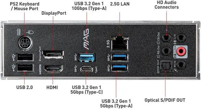 Audio Chipset Realtek ALC1200 Audio Channels 7.1 -Channel High Definition Audio Supports S/PDIF output LAN Chipset Realtek RTL8125B Max LAN Speed 10/100/1000/2500Mbps Back I/O Ports 1 x DisplayPort / 1 x HDMI / 1 x LAN (RJ45) / 1 x Optical S/PDIF Out / 1 x PS/2 Keyboard/Mouse Combo / 1 x USB 3.2 Gen 1 Type-C / 2 x USB 2.0 / 1.1 / 3 x USB 3.2 Gen 1 / 5 x Audio Jacks Onboard USB 1 x USB 3.2 Gen 1 5Gbps connector (support additional 2 USB 3.2 Gen 1 5Gbps ports) 1 x USB 3.2 Gen 1 5Gbps Type-C connector 2 x USB 2.0 connectors (support additional 4 USB 2.0 ports) Other Connectors 1 x 4-pin CPU fan connector 1 x 4-pin water pump connector 2 x 4-pin system fan connectors 1 x front panel audio connector 2 x system panel connectors 1 x TPM module connector 1 x Chassis Intrusion connector 1 x Clear CMOS jumper 1 x 4-pin RGB LED connector 1 x 3-pin RAINBOW LED connector 1 x TBT connector * 1 x RTD3 connector* * Thunderbolt card need support RTD3 Form Factor Micro ATX LED Lighting RGB Dimensions (W x L) 9.6" x 9.6" Power Pin 1 x 24-pin ATX main power connector 1 x 8-pin ATX 12V power connector Features Supports 10th Gen Intel Core / Pentium Celeron processors for LGA 1200 socket Supports DDR4 Memory, up to 2933 MHz (Max) Enhanced
