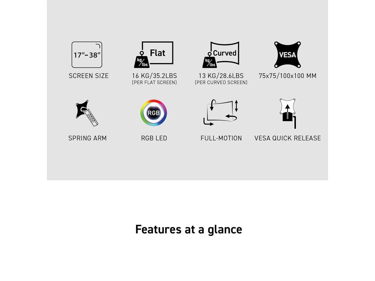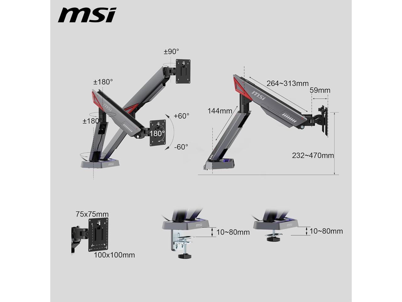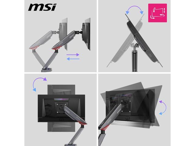 - Heavy Duty Design: Experience durability and reliability with the MSI MPG MT161DR Premium Single Monitor Stand Arm, supporting screen sizes from 17 to 38 inches and a weight capacity of 2 to 16 kg (4.4 to 35.2 lbs) per screen.
