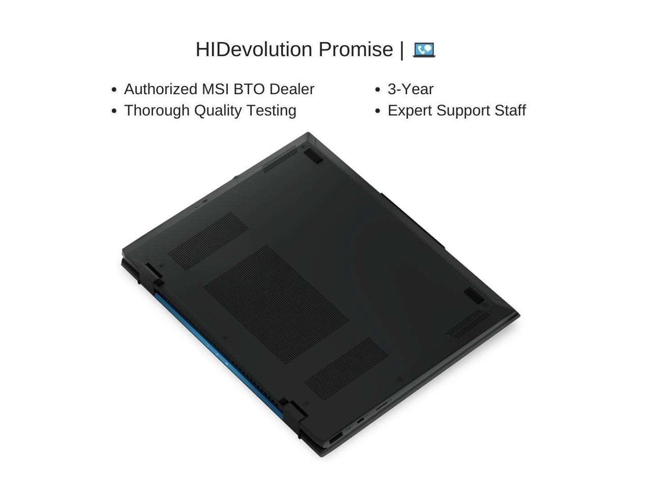 Operating System: Windows 11 Pro. HIDevolution Promise: Authorized MSI Build to Order Dealer, thorough quality testing, a 3 Year Warranty, and access to our expert support staff. Contact us for more customization options.