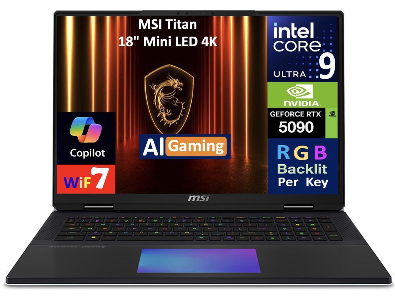 MSI Titan AI Gaming Laptop 18" 120Hz Mini LED 4K Display (Intel Ultra 9- 285HX, NVIDIA GeForce RTX 5090 24GB, 64GB DDR5, 8TB PCIe SSD, Per Key RGB KB, 2 Thunderbolt 5, WiFi 7, Webcam, Win 11 Pro)