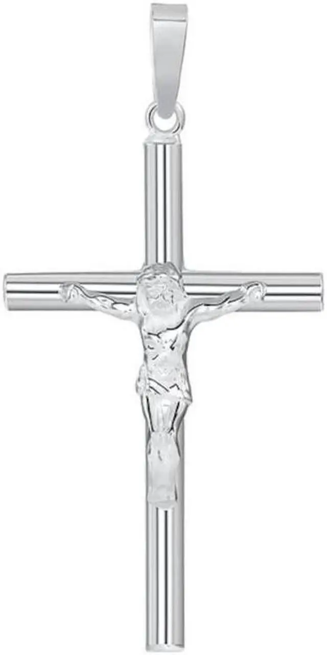 925 Sterling Silver Tube Lord Jesus Christ Crucifix Holy Cross Necklace Charm Pendant Height 59mm Approx Weight 6.3 g With 16" Rollo Diamond Cut Chain, All Ages Cross07-BRT040