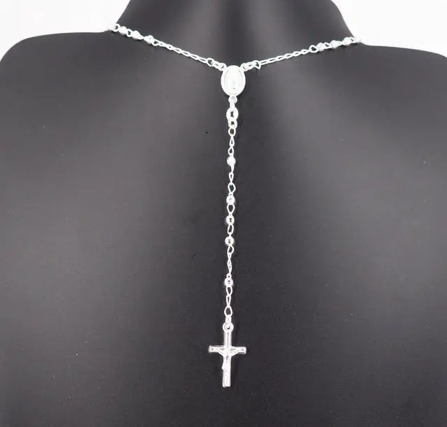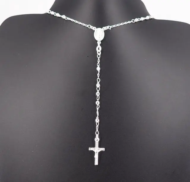 Solid 925 Sterling Silver 3mm Rosary 22 with Virgin Mary Guadalupe in the center of the necklace and Tube Cross Hanging & Jesus beautifully hanging from the chain