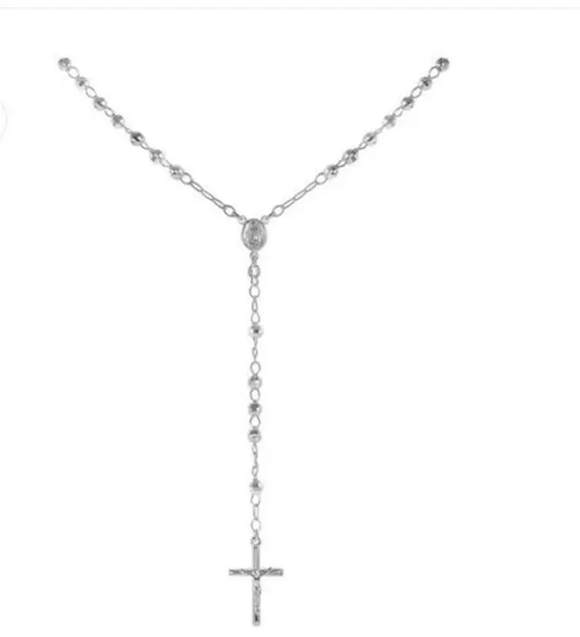 Solid 925 Sterling Silver Diamond Cut 3mm Rosary 18 with Virgin Mary Guadalupe in the center of the necklace and Tube Cross Hanging & Jesus beautifully hanging from the chain