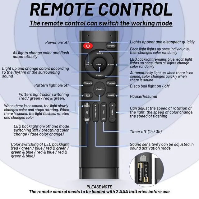 Multifunction Remote: Install 2xAAA batteries in the remote control before use, One-click through 7 lighting modes, and control the turning off and on of each light individually, adjust the speed, pause, fine-tune the sensitivity, and set the timer (1h/3h/continuous).