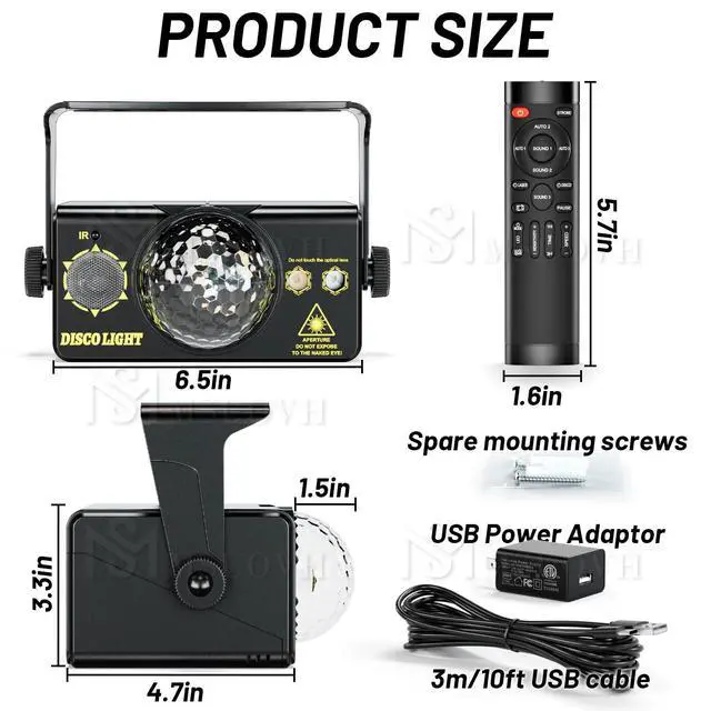 7 Lighting Modes: 3 Sound-Activated (Lights change to the beat of ambient music), 3 Auto modes (light color changes automatically), 1 Strobe Mode, Elevate your dance floor instantly!