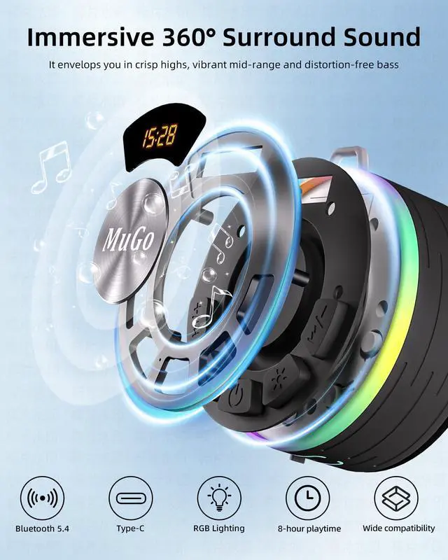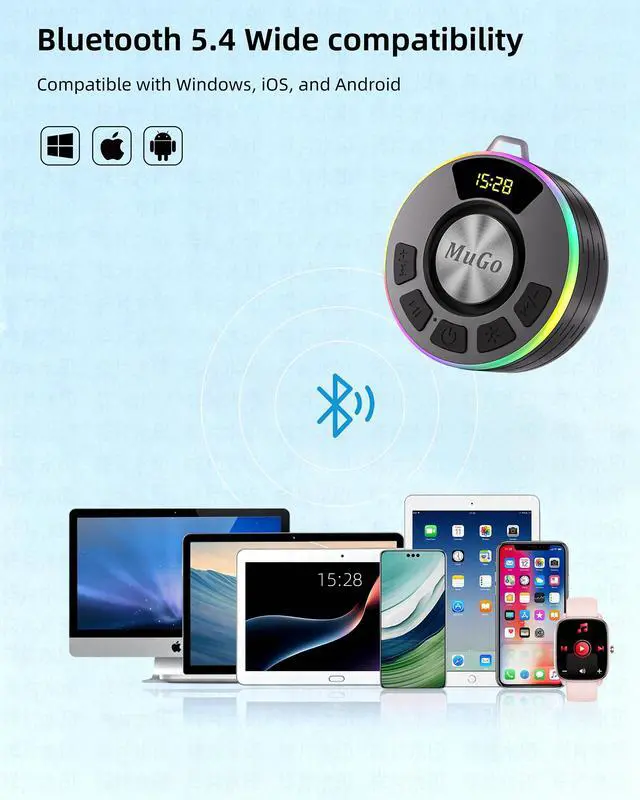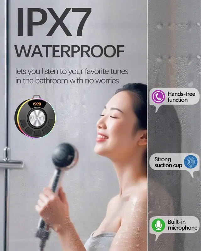 Bluetooth Shower Speaker, 360° HD Stereo Sound, IPX7 Waterproof Wireless Speaker Bluetooth 5.4 with RGB Lights, Suction Cup and Microphone, Small Shower Radio for Home/Party/Outdoor/Gifts