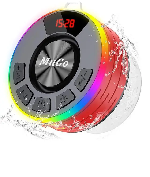 Shower Bluetooth Speaker Waterproof IPX7, 360° HD Stereo Sound Bathroom Speaker Bluetooth 5.3 with RGB Lights, Suction Cup and Microphone, Mini Shower Radio for Home/Party/Outdoor