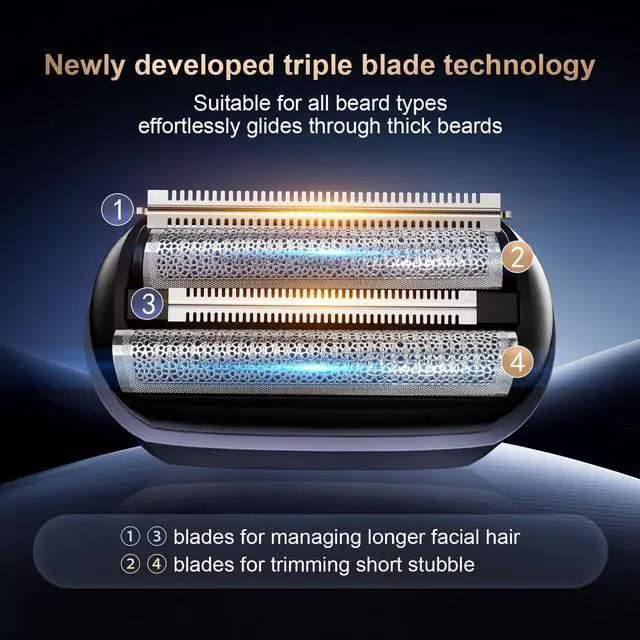 Triple Floating Blade System: Experience effortless, skin-friendly shaving with three independent floating heads that seamlessly adapt to every curve of your face and neck. This design ensures a close, thorough shave without missed spots, while the hypoallergenic foil and blades significantly reduce pulling and irritation, leaving your skin smooth and comfortableeven if you have sensitive skin