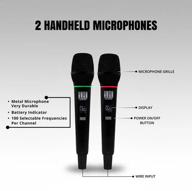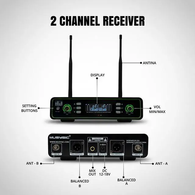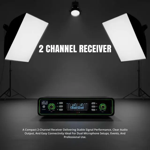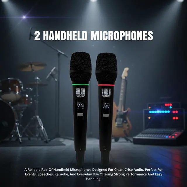 The MUSYSIC MUMF5U2 is a professional dualchannel UHF wireless microphone system engineered for performers, presenters, DJs, churches, schools, and event venues that require stable, interferenceresistant audio. Operating in the 500-580MHz UHF band, this system provides reliable transmission, excellent clarity, and longrange performance suitable for multisystem environments.