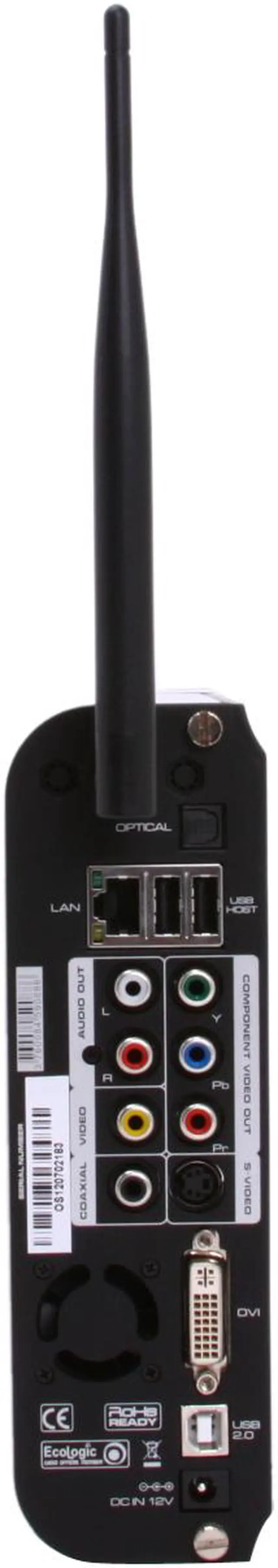 | Connectors | Video Output: Composite, S-Video, Component, and DVI Audio Output: Analog - Stereo RCA, Digital - Coaxial, Optical (5.1 CH) Networking: Wire - Ethernet (10/100) LAN via RJ-45 Port, Wireless - Wireless LAN : 802.11b/g USB Interface: USB2.0 host, USB2.0 Slave |