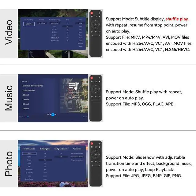 | Picture format support | JPEG, GIF(Still picture), BMP, PNG, etc. Support rotate, zoom and slideshow |