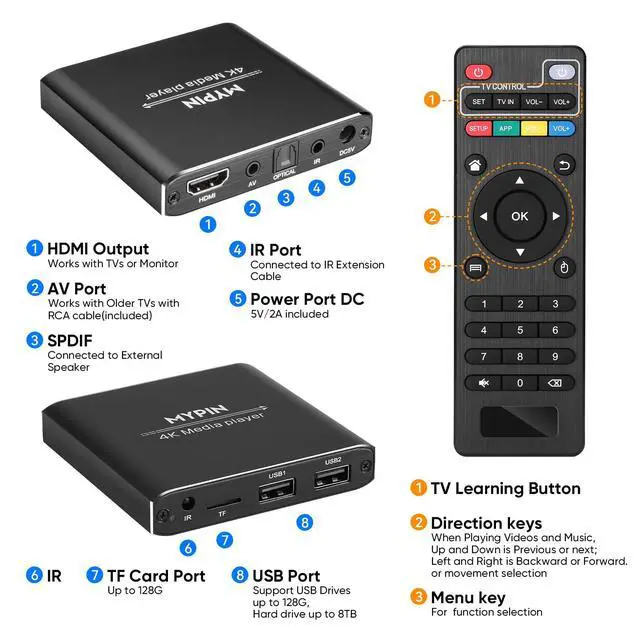 - Video format: H.265 (MKV/MOV/AVI), MPEG1-2-4 (DAT/VOB/AVi), WMV9/VC-1, H.265 AVI DIVX, AVI, DIVX, MKV, MOV, HDMOV, MP4, M4V, PMP, AVC, FLV, MPG, MPEG, WMV, VOB, WEBM