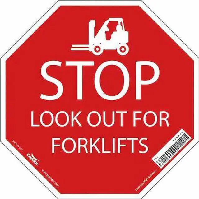 Safety Sign, Octagon, Number of Printed Sides 1, English, Sign Format Other Format, Sign Legend Stop Look Out For Forklifts, Sign Legend Background Color Red, White, Sign Legend Style Symbol and Text