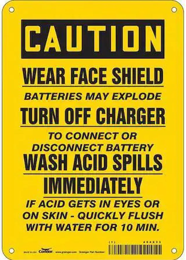 California Proposition 65: This product contains a chemical known to the State of California to cause birth defects or other reproductive harm. Safety Sign, Horizontal Rectangle, Number of Printed Sides 1, English, Sign Format Traditional OSHA, Sign Legend Wear Face Shield-Batteries May Explode, Turn Off Charger- To Connect Or Disconnect Battery, Wash Acid Spills Immediately- If Acid Gets In Eyes Or On Skin - Quickly Flush With Water For 10 Min., Sign Legend Background Color Yellow, Sign Legend Style Text
