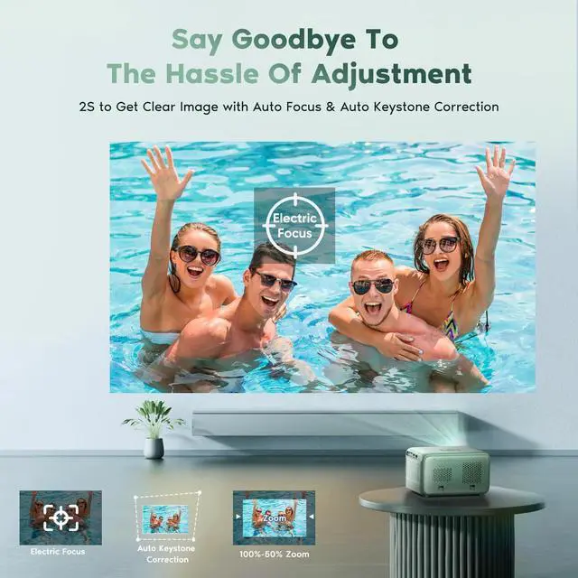 - [Electric Focus & Auto Keystone Correction]No more cumbersome manual Settings. This projector features intelligent electric focus and auto keystone correction functions, enabling you to quickly obtain clearer and proportionally accurate rectangular images. Adjust focus effortlessly with the remote control, while auto keystone correction instantly fixes distorted images. Perfect alignment in secondsany angle, any surface!