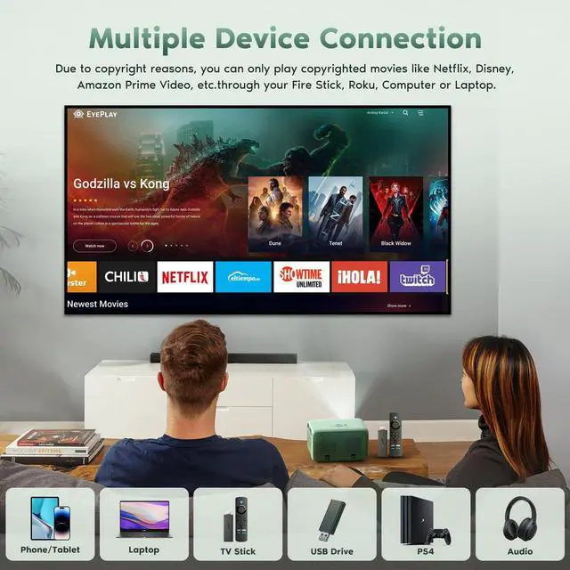 - [300-inch Large Screen and 50%-100% Zoom Function] Compared with a 60-inch fixed TV, the display width of the mini projector can range from 40 inches to 300 inches and be flexibly set from 1.5 meters to 5 meters. The 50-100% zoom function allows you to adjust the projection to a comfortable size without having to move the projector!