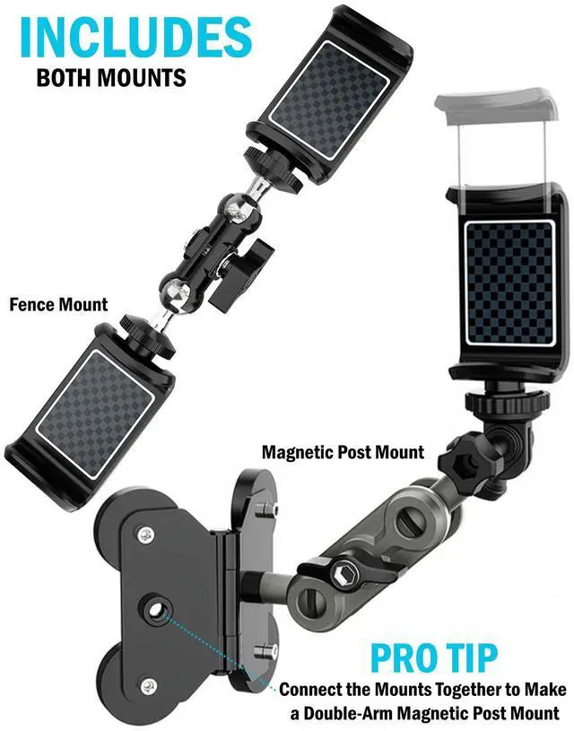 #2 MAGNETIC POST MOUNT: The ultra strong magnetic bracket is suitable for any metal post - Commonly found at baseball parks, softball fields, tennis courts, basketball post, etc - Very practical and versatile for many other locations or applications. Includes cell phone holder. The spring tension mount fits virtually any cell phone, iPhone, etc. Use your phone to record or stream the game. The metal ball joint offers 360 rotation and tilt. Adjust to your perfect angle/orientation then tighten the wingnut to lock in place. If you dont attach the phone holder you can use the standard. 25 inch screw as a connection point. Therefore this is compatible with other camera devices such as Mevo Start, Go Pro, Digital Camera, etc. Record the game with a stable and secure rig.