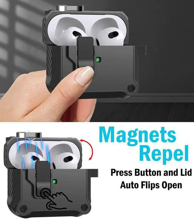 SECURE MAGNETIC LID: When you close the lid, you'll hear and feel the latch "click" secure. Enjoy peace of mind, knowing your Airpods Pro 3 are secure shut. Press the bottom button on the latch and your lid will spring open (as a result of same magnetic polarity). Such cool and useful technology that is convenient (and very satisfying to press).