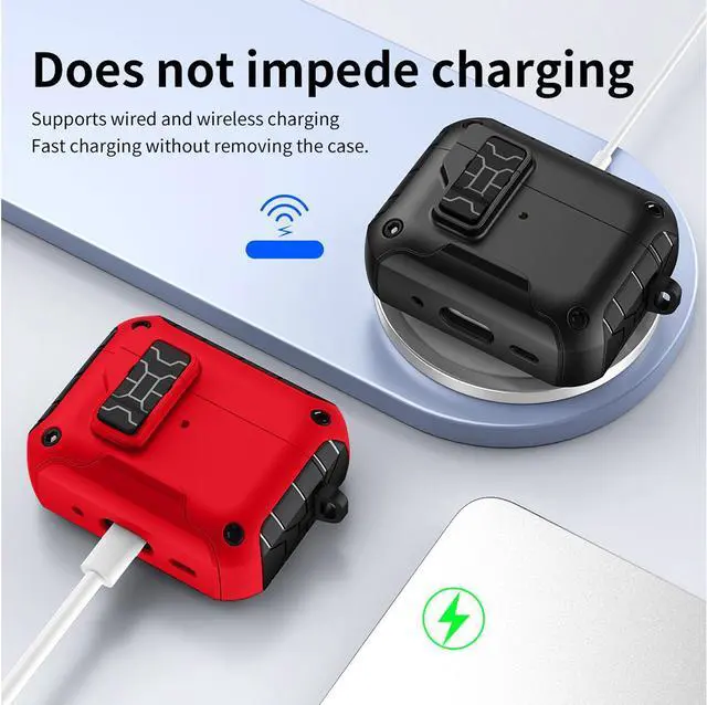 LIKE POLES REPEL: Magnets are also incorporated within the lid. Press the bottom button on the latch and your lid will spring open (as a result of same magnetic polarity). Such cool and useful technology that is convenient (and very satisfying to press). When you close the lid, you'll hear and feel the latch "click" secure. Enjoy peace of mind, knowing your Airpods Pro 3 are secure shut.