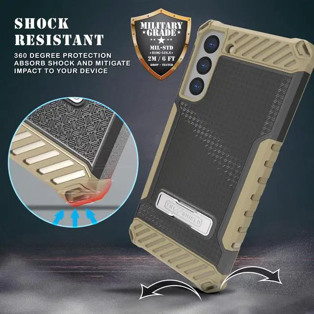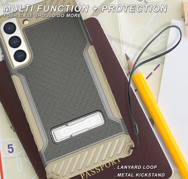 The Tri-Shield Case provides kickstand viewing, enhanced grip, unique style and Military-Grade drop protection.