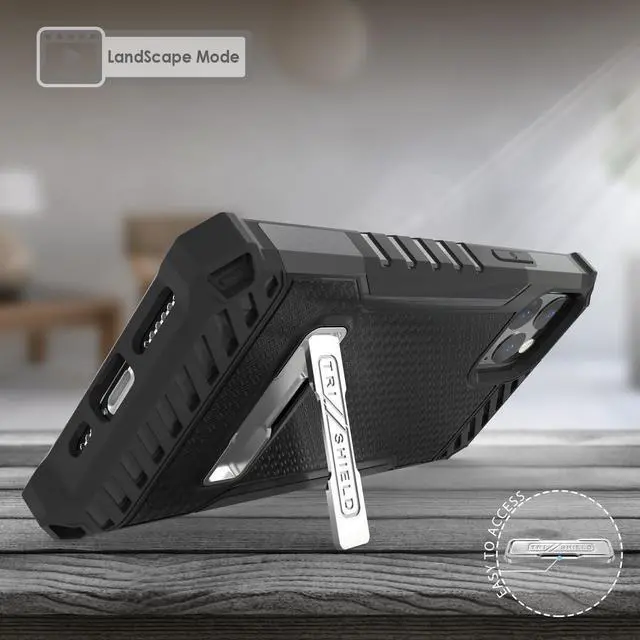 The Tri-Shield Case provides kickstand viewing, enhanced grip, unique style and Military-Grade drop protection.