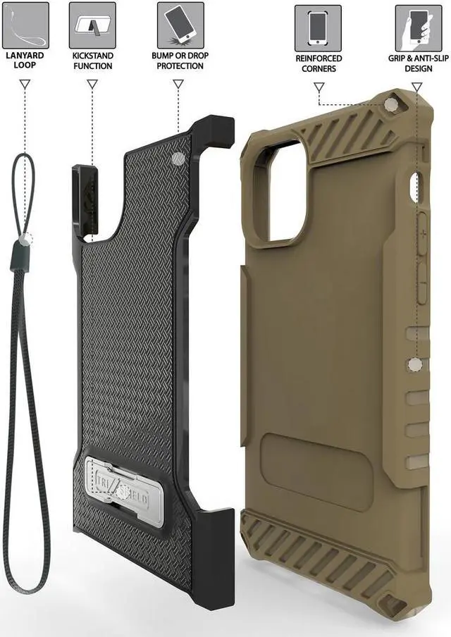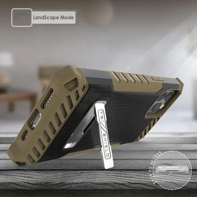 The Tri-Shield Case provides kickstand viewing, enhanced grip, unique style and Military-Grade drop protection.