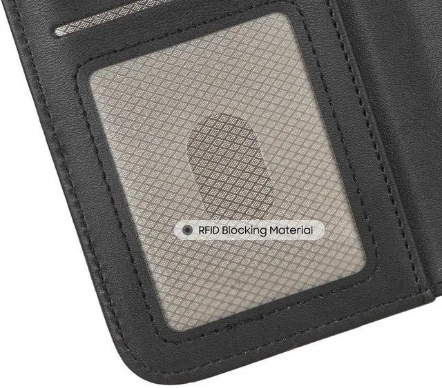 RFID SIX-CARD STORAGE: Black vegan leather wallet features three (3) card slots on the interior left side. Each slot can hold 2 cards and equipped with RFID protection. Behind the left panel youll see one full-length slot for cash. Now you can carry all the essentials: phone, credit cards, business cards, ID, license, club cards, cash, etc. Everything you need in one place! Side magnetic flap will keep the case closed shut.