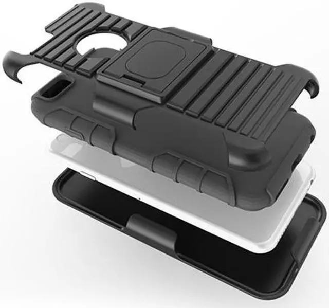 BELT CLIP HOLSTER: The industrial holster was custom made to fit this case. It is made of a hard polycarbonate and it was molded to fit the phone face-inward to protect the lcd screen. Industrial belt clip will turn/lock in 13 different positions. Attach to your side and always have quick access to your phone. The holster also has a kickstand feature so you can prop on a table.