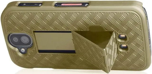 Back of the case features built-in kickstand feature. Unsnap the hinge then slide downward until the kickstand snaps into place. Now you can prop your phone in vertical position at your desk or prop the phone in horizontal position - this is ideal for watching movies and YouTube videos - also comes in handy if you use your phone as an alarm clock.
