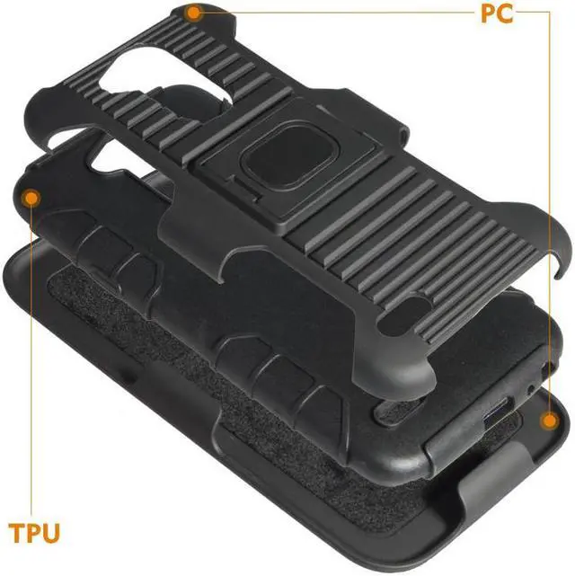 BELT CLIP HOLSTER: The industrial holster was custom made to fit this case. It is made of a hard polycarbonate and it was molded to fit the phone face-inward. This design keeps your screen concealed and protected. Industrial belt clip will turn/lock in 13 different positions. Attach to your side and always have quick access to your phone. The holster also has a kickstand feature so you can prop on a table.