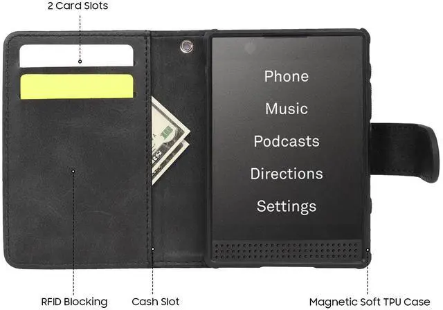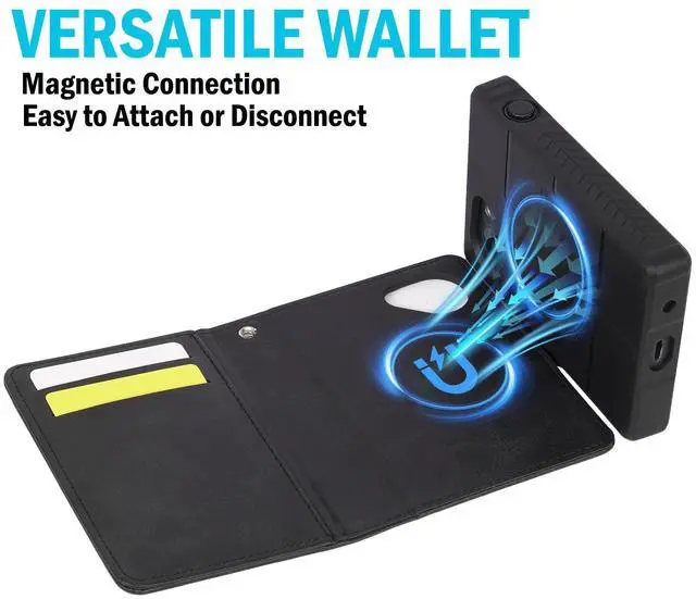 WALLET: The wallet magnetically connects to included case in the blink of an eye. The black leather wallet features three (3) storage compartments on the interior left side. The two RFID credit card slots will accommodate two cards in each slot. Behind the left panel youll see one full-length slot. Now you can carry your phone, credit cards, business cards, folded cash, etc, all in one case! Side magnetic flap will keep the case closed shut - no complicated snaps or buttons.
