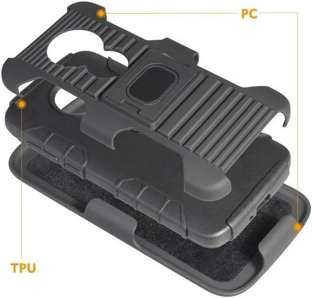 BELT CLIP HOLSTER: The industrial holster was custom made to fit this case. It is made of a hard polycarbonate and it was molded to fit the phone face-inward. This design keeps your screen concealed and protected. Industrial belt clip will turn/lock in 13 different positions. Attach to your side and always have quick access to your phone. The holster also has a kickstand feature so you can prop on a table.