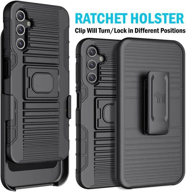 BELT CLIP HOLSTER: Industrial holster was custom made to fit this case. It is made of a hard polycarbonate and it was molded to fit the phone face-inward so your screen is concealed/protected. Belt clip will turn/lock in 13 different positions. Attach to your side and always have quick access to your phone. The holster also has a kickstand feature so you can prop on a table.