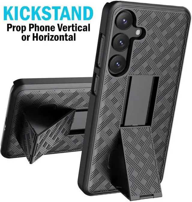 CASE KICKSTAND: Back of the case features built-in kickstand. Unsnap the hinge then slide downward until the kickstand snaps into place. Now you can prop your phone in vertical/horizontal positions at your desk - This is ideal for watching movies and videos - also a handy prop for those "face-to-face" handsfree video calls.