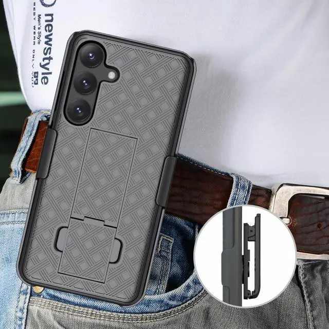 BELT CLIP: Holster is made to fit the phone with cover. The interior is lined with soft micro-fiber material to ensure your screen will remain cozy and scratch free. The holster is designed to hold the phone "face-inward" so your screen is concealed and protected while on the go. Clip can turn/lock in 13 different positions and has a slim profile so it will not extend far from your waist and bump into things. Attach the clip to your side and always have quick access to your phone. Your phone slides in/out of the holster - Like an old western, you'll be quick on the draw!.