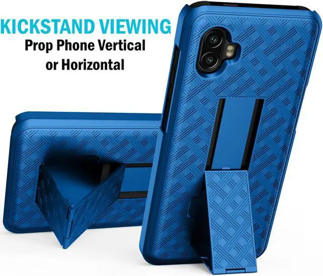 CASE KICKSTAND: Back of the case features built-in kickstand. Unsnap the hinge then slide downward until the kickstand snaps into place. Now you can prop your phone in different positions at your desk. Horizontal - This is ideal for watching movies and videos. Vertical - This is a handy prop for those "face-to-face" handsfree video calls.