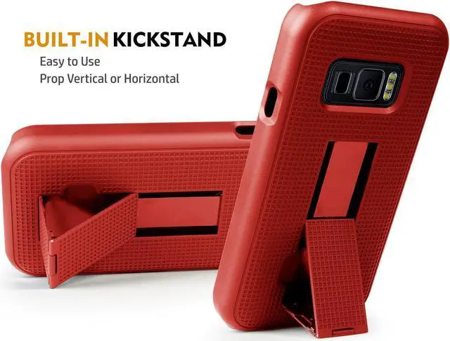 Back of the case features built-in kickstand. Unsnap the hinge then slide downward until the kickstand snaps into place. Now you can prop your phone in vertical position at your desk or prop the phone in horizontal position - this is ideal for watching movies and YouTube videos - also comes in handy if you use your phone as an alarm clock.