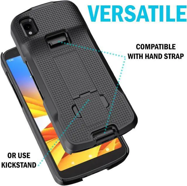 FUNCTIONALITY: Your device is fully functional in the case with cutouts to access all buttons/ports and sensors. If you do not use a hand strap then you can utilize the case's kickstand feature. Back of the case features built-in stand. Unsnap the hinge then slide downward until the kickstand snaps into place. Now you can prop your scanner in different positions at your desk or workstation.