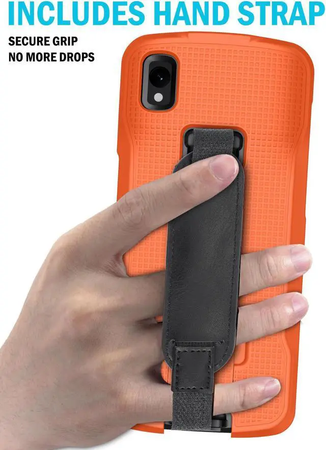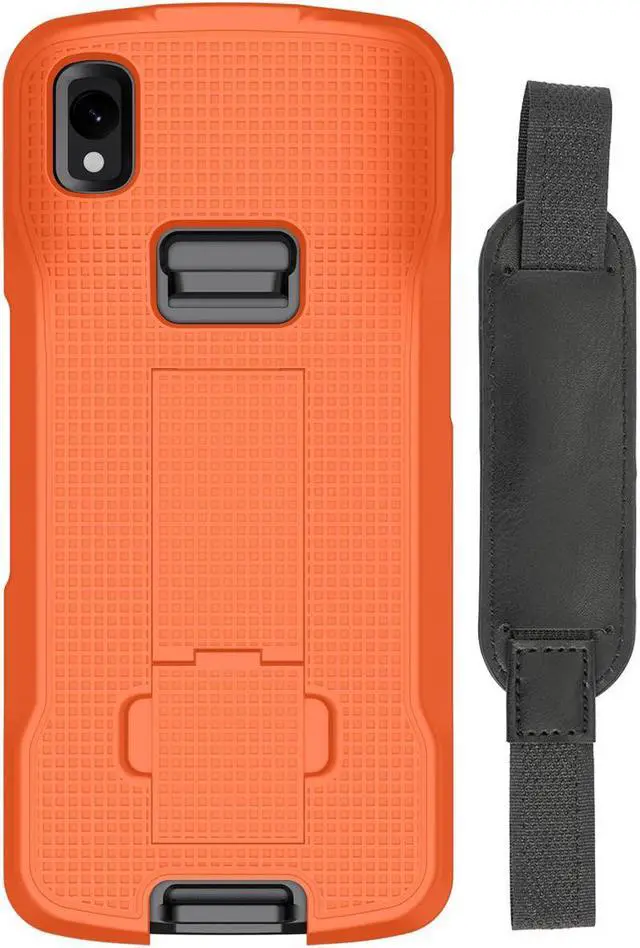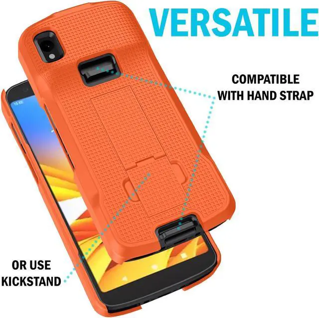 FUNCTIONALITY: Your device is fully functional in the case with cutouts to access all buttons/ports and sensors. If you do not use a hand strap then you can utilize the case's kickstand feature. Back of the case features built-in stand. Unsnap the hinge then slide downward until the kickstand snaps into place. Now you can prop your scanner in different positions at your desk or workstation.