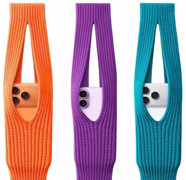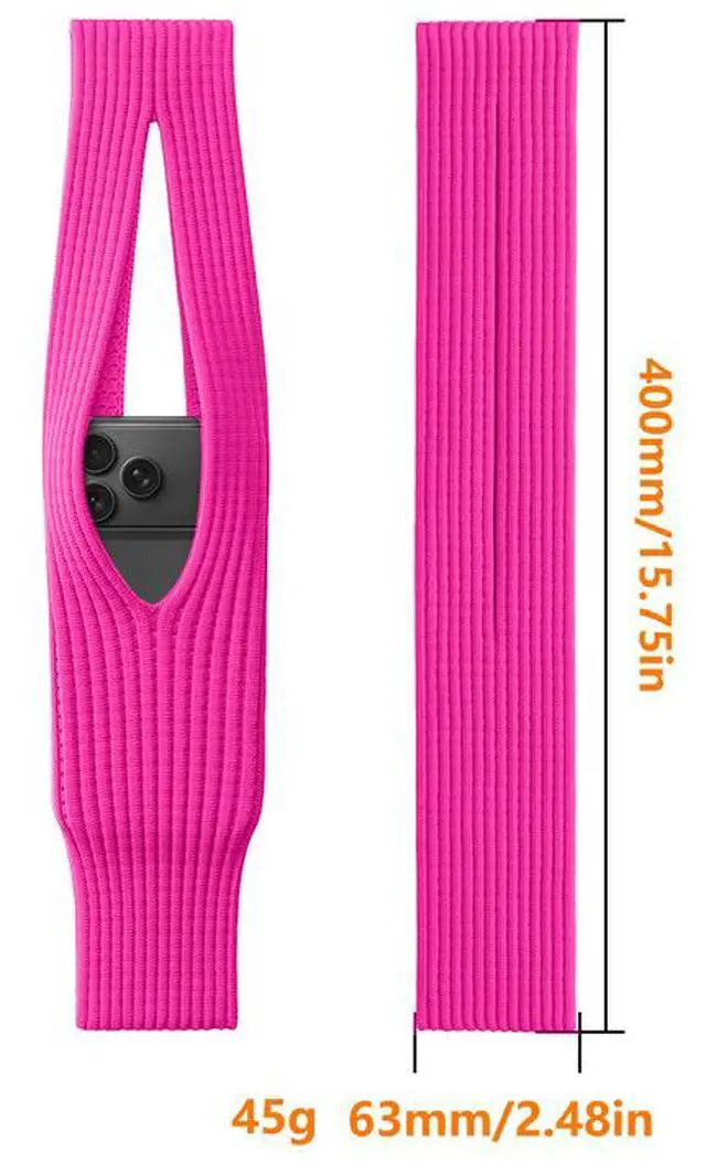 Features ribbed vertical lines like a tube sock from the 1980s and stretches to reveal intricate webbing. Everyone wears socks. your phone deserves the same, duh! Simply slide your phone into the stretchy pouch and carry your phone in style! The universal design can fit any cell phone, iphone etc. Carry in your hand or dangle from the elbow. You can also loop it on your handbag/purse strap.