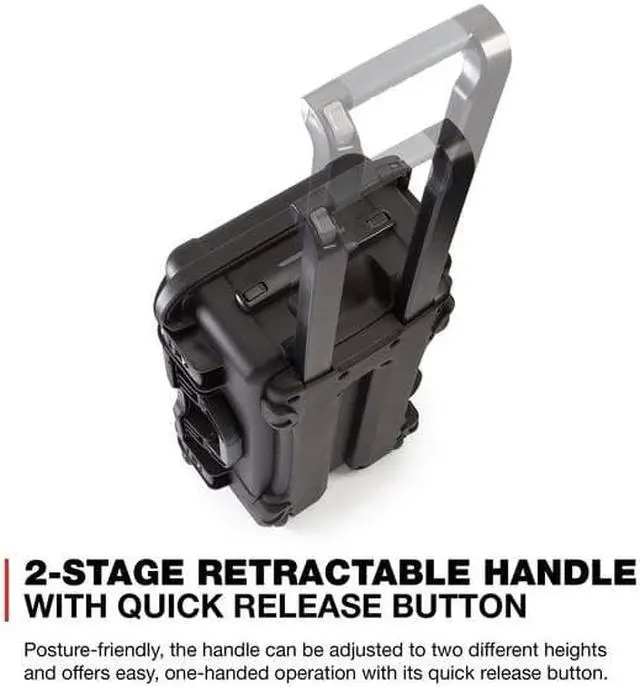 A fortress for your photography gear, the Wheeled Series 935 Lightweight NK-7 Resin Waterproof Protective Case with Foam is the ultimate safeguard for your DSLR camera, three lenses, flash, and additional equipment. Engineered with a robust PowerClaw Latching System, this case boasts a patented design (US Patent No. 8,297,464) that ensures a secure closure through compressive force, while the integrated slide lock prevents accidental openings during transit or if dropped. The durable, super tough nylon construction promises that your valuable items are protected no matter the destination.