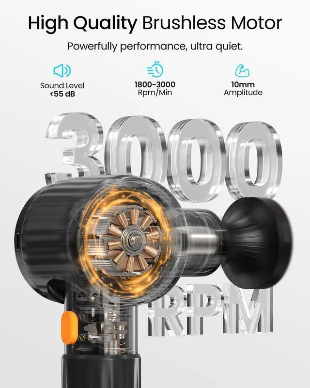 Introducing the Massage Gun the future of muscle recovery and pain relief. Designed for athletes, fitness lovers, and everyday users, this advanced percussion massager combines deep-tissue therapy with innovative heat to target soreness and tension effectively. With its unique heated head, choose from three precise temperature levels (102°F-113°F / 39°C-45°C) that activate in just 3 seconds for deeper muscle relaxation and accelerating recovery. Customize your massage experience with three adjustable angles, five speed levels (18003000 RPM), and six interchangeable heads for every body part. The intuitive 1.97-inch LED display and one-touch controls make operation effortless, while the extended 8.66-inch anti-slip handle ensures comfort and reach. Powered by a robust brushless motor, the massage gun delivers a penetrating 10mm amplitude yet operates at under 55dB for quiet, undisturbed use. The USB-C PD 15W fast charging provides up to 3 hours of continuous use, and safety features like auto-shutoff and overheating protection offer peace of mind. Everything comes neatly packaged in a high-quality portable case, professional-grade recovery at home or on the go. Elevate your recovery routine with S40 where innovation meets relief.
