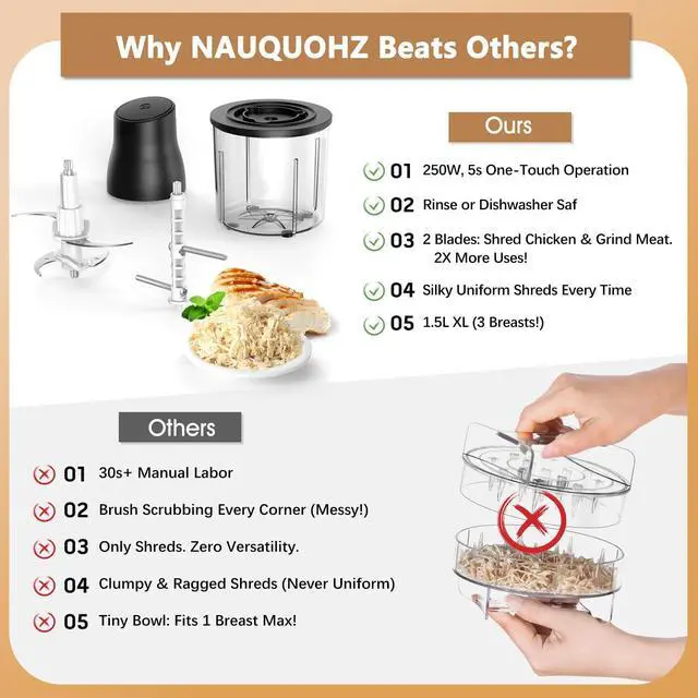 100% Faster Chicken Shredder Compared with the old manual chicken shredder, effortlessly create finer, more uniform chicken shreds in just 3-5 seconds with our upgraded electric chicken shredder, featuring a professional 250W motor and uniquely designed wire drawing knife.doubling the efficiency of manual tools. Imagine juicy chicken breasts becoming a cloud of perfect shreds before you finish counting to five!