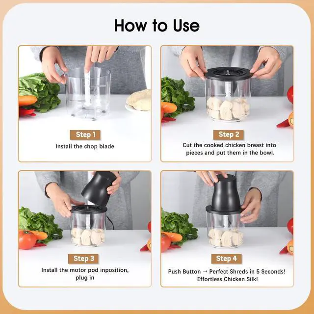 Easy to Operate1, We need to cook chicken breast first and cut it into small pieces, forbid using raw meat to shred it, as it will damage the chicken shredder. 2, Meats and vegetables do not need to be cooked, just cut into small pieces and put into the container. All with a simple push to start, open the lid to enjoy the delicious chicken. Non slip base under the bowl bottom help the food chopper keep stability.
