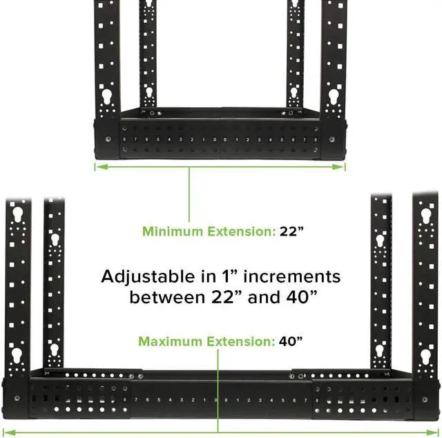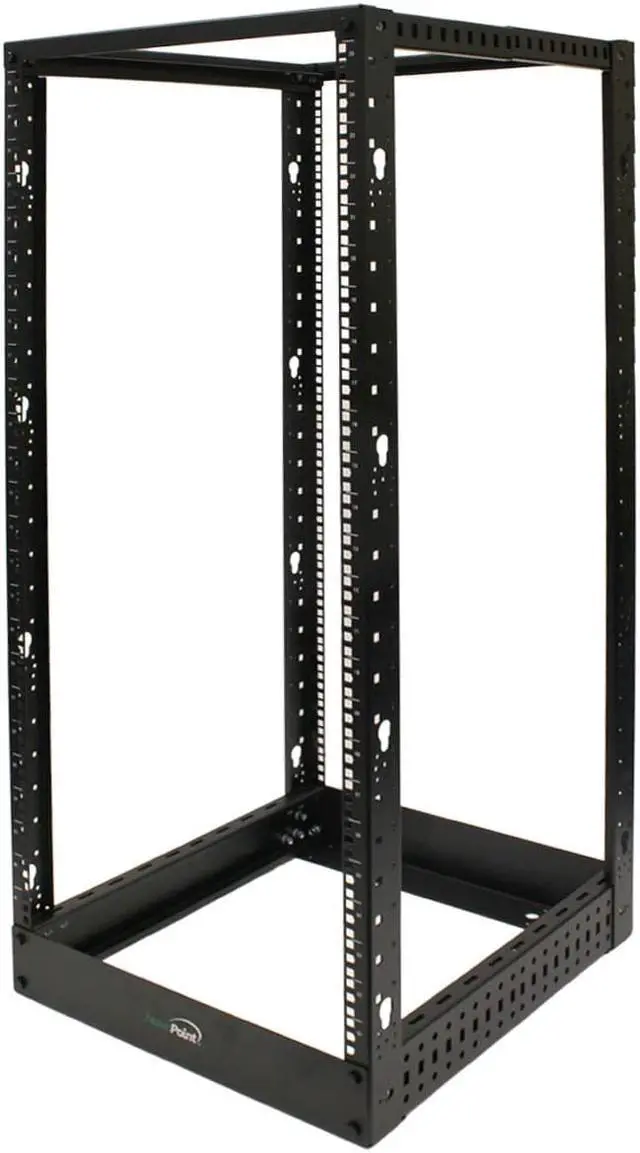 This 4-post open frame adjustable depth rack by NavePoint is great for organizing your networking equipment. Comes flat-packed and requires some assembly. Made of high-quality SPCC Cold Rolled Steel with a powdered coated finish for durability. Available in a variety heights.