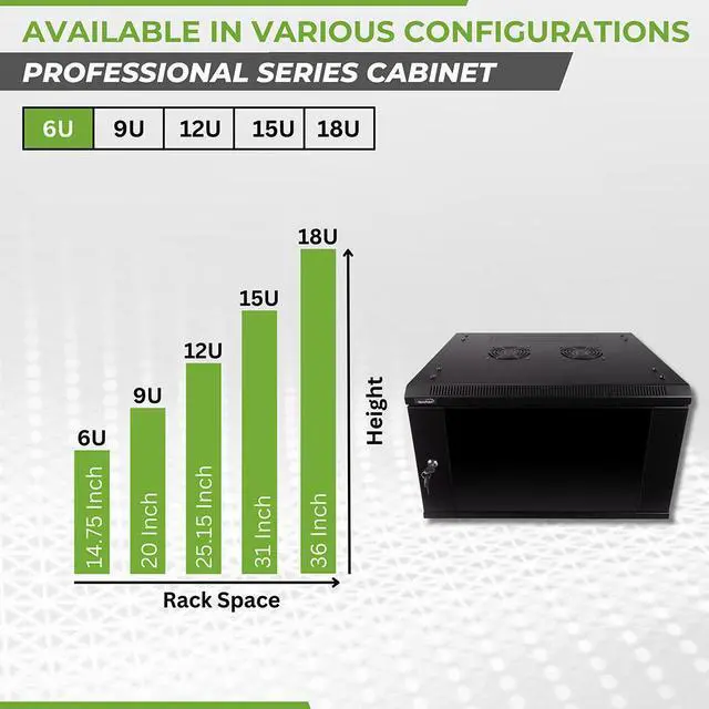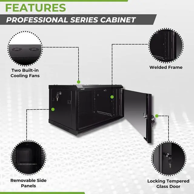 This 450mm depth cabinet by NavePoint is part of the Pro Series and can be wall-mounted or self standing and is great for organizing your networking equipment. It has removable, locking side panels for easy access, along with venting slots and (2) built-in fans to keep your equipment cool. Made of high-quality SPCC Cold Rolled Steel with electro-static powdered coated finish. Comes flat-packed and requires some assembly. Available in 6U, 9U, 12U, 15U and 18U configurations.
