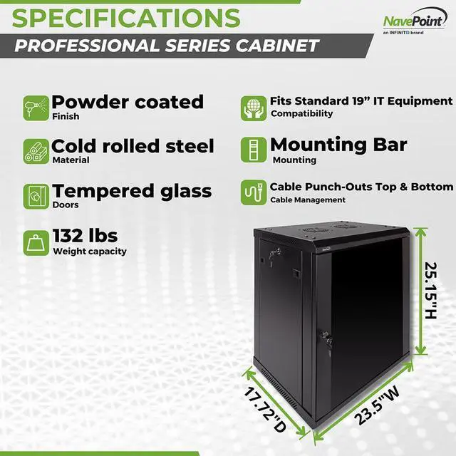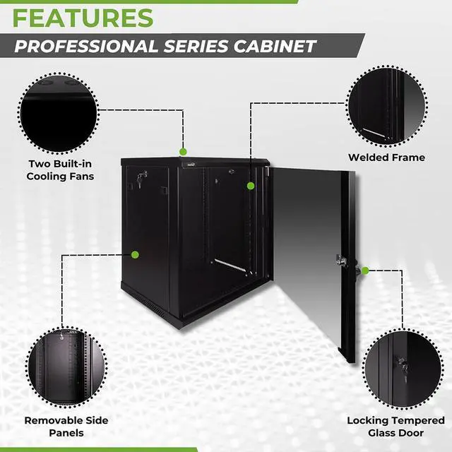 This 450mm depth cabinet by NavePoint is part of the Pro Series and can be wall-mounted or self standing and is great for organizing your networking equipment. It has removable, locking side panels for easy access, along with venting slots and (2) built-in fans to keep your equipment cool. Made of high-quality SPCC Cold Rolled Steel with electro-static powdered coated finish. Comes flat-packed and requires some assembly. Available in 6U, 9U, 12U, 15U and 18U configurations.