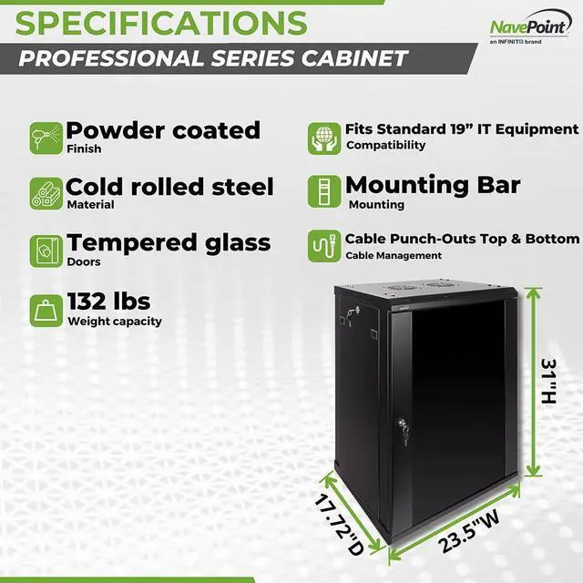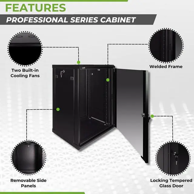 This 450mm depth cabinet by NavePoint is part of the Pro Series and can be wall-mounted or self standing and is great for organizing your networking equipment. It has removable, locking side panels for easy access, along with venting slots and (2) built-in fans to keep your equipment cool. Made of high-quality SPCC Cold Rolled Steel with electro-static powdered coated finish. Comes flat-packed and requires some assembly. Available in 6U, 9U, 12U, 15U and 18U configurations.